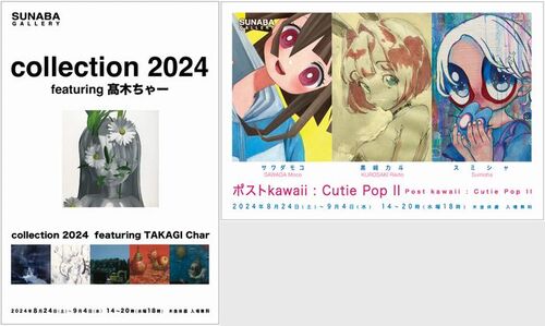 8月27日は、会社帰りにSUNABAギャラリーに寄ってきました。 「collection 2024 featuring 髙木ちゃー」と「ポストkawaii : Cutie Pop II」の二つのグループ展をやってます。盆休みが終わって、芸術の秋の始まる前の一番客足の途絶える時期ですから(^^; メ…